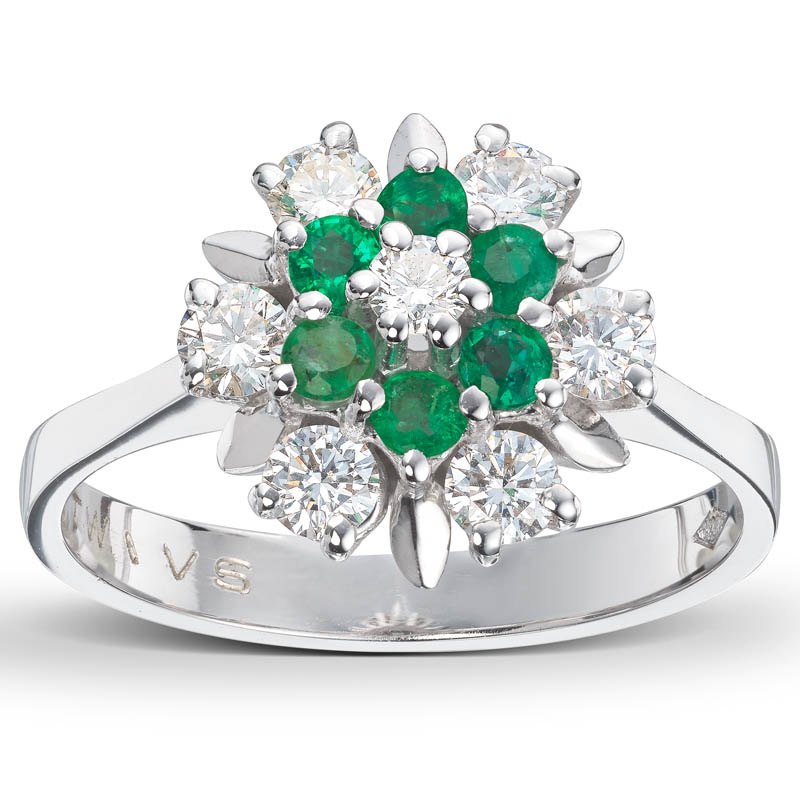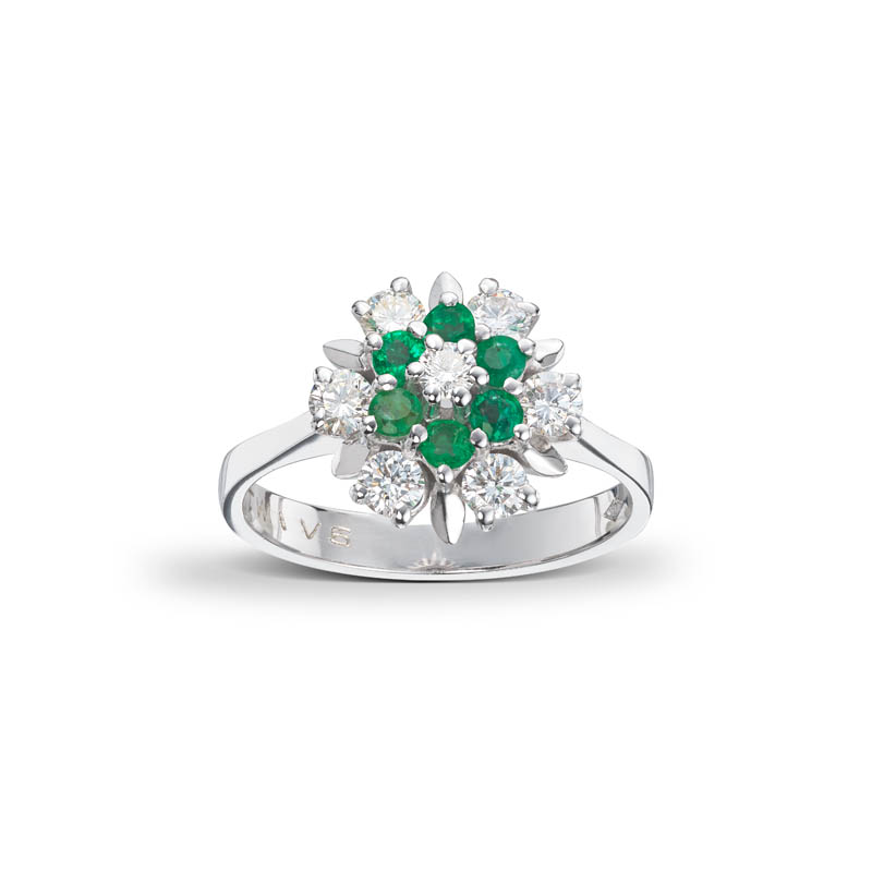 Rosettring i 14kt (585) hvitt gull med smaragder og diamanter