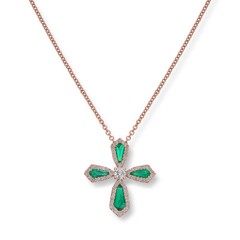 Smaragdkors med diamanter fattet i 18 kt rosègull, inkludert kjede på 41 cm ( m. ring på 44 cm)